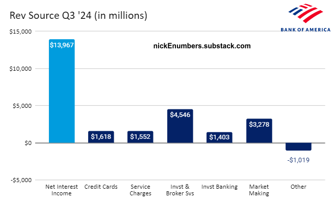 First, I have a visual for you below of the most recent Bank of America earning release, 9/30/24, to illustrate the sources of revenue.